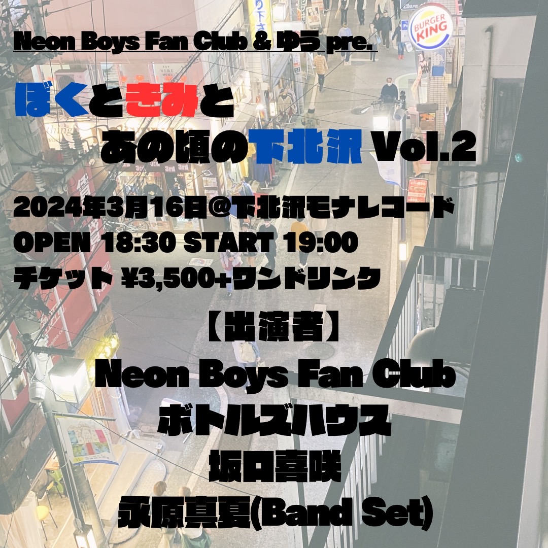 | 出演 | Neon Boys Fan Club / 坂口喜咲 / 永原真夏(Band Set) / ボトルズハウス |