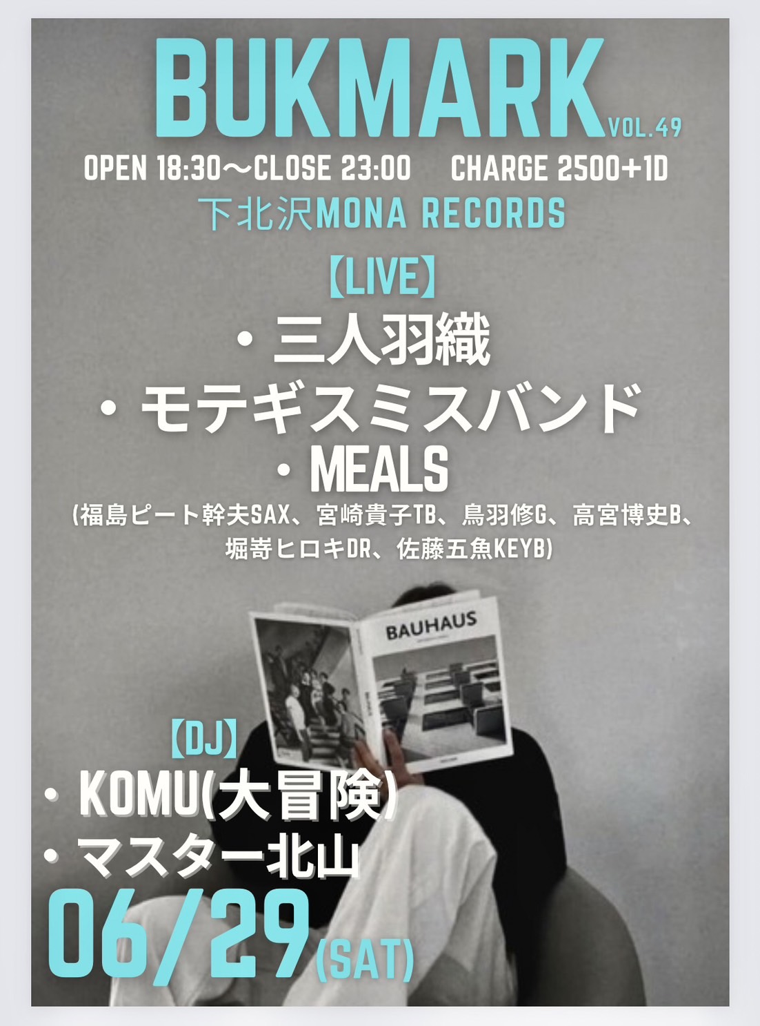 | 出演 | 【Live】 ・三人羽織 ・モテギスミスバンド ・MEALS(福島ピート幹夫sax、宮崎貴子tb、鳥羽修g、高宮博史b、堀嵜ヒロキdr、佐藤五魚keyb) 【Dj】 ・komu(大冒険) ・マスター北山 |
