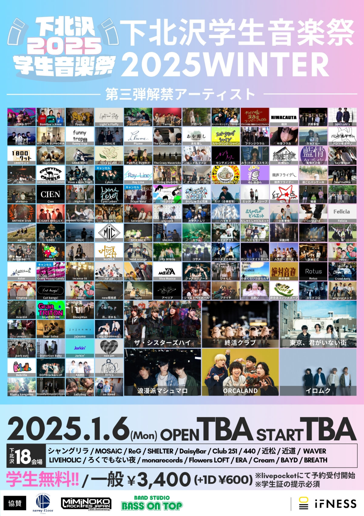 | 出演 | 会場:MOSAiC / CLUB 251 / 440 / ReG / LIVEHOLIC / ろくでもない夜 / WAVER / mona records / ERA / Flowers Loft / BREATH / 近松 / 近道 / Cream / BAYD / SHELTER / Daisy bar / Shangri-La |