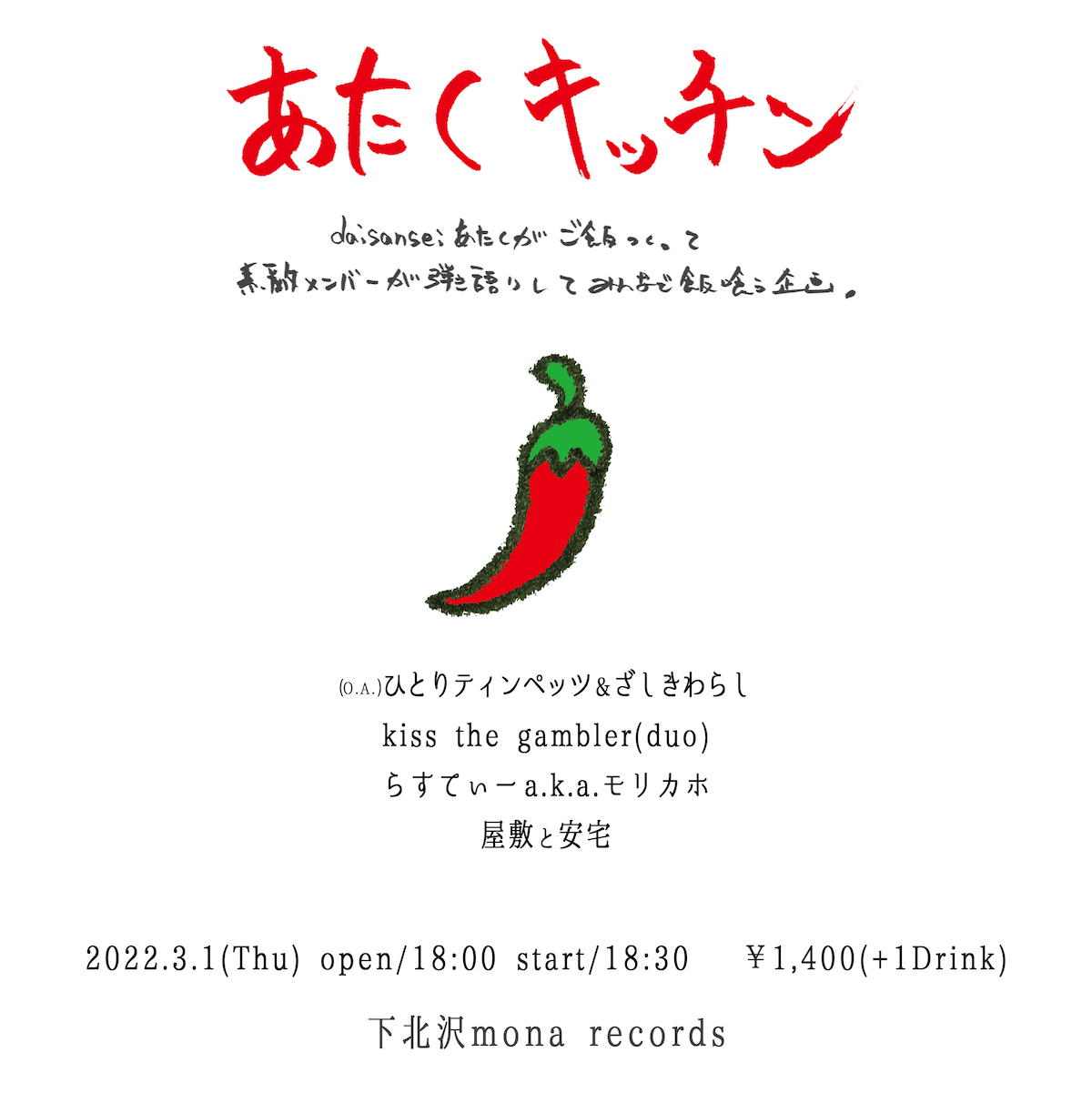 | 出演 | らすてぃ~a.k.a.モリカホ / 屋敷と安宅 / kiss the gambler / (O.A.)ひとりティンペッツ&ざしきわらし |
