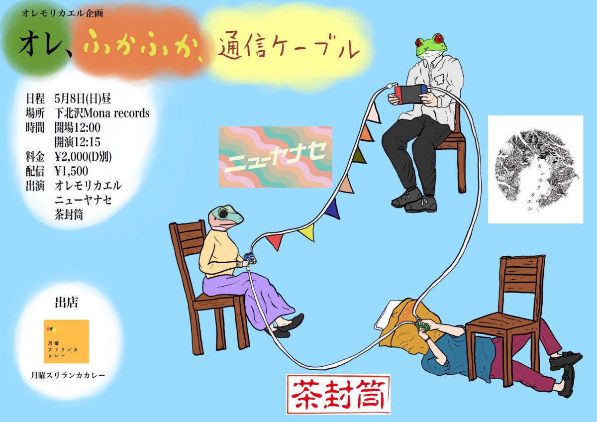 | 出演 | 【LIVE】オレモリカエル / 茶封筒 / ニューヤナセ 【FOOD】月曜スリランカカレー |