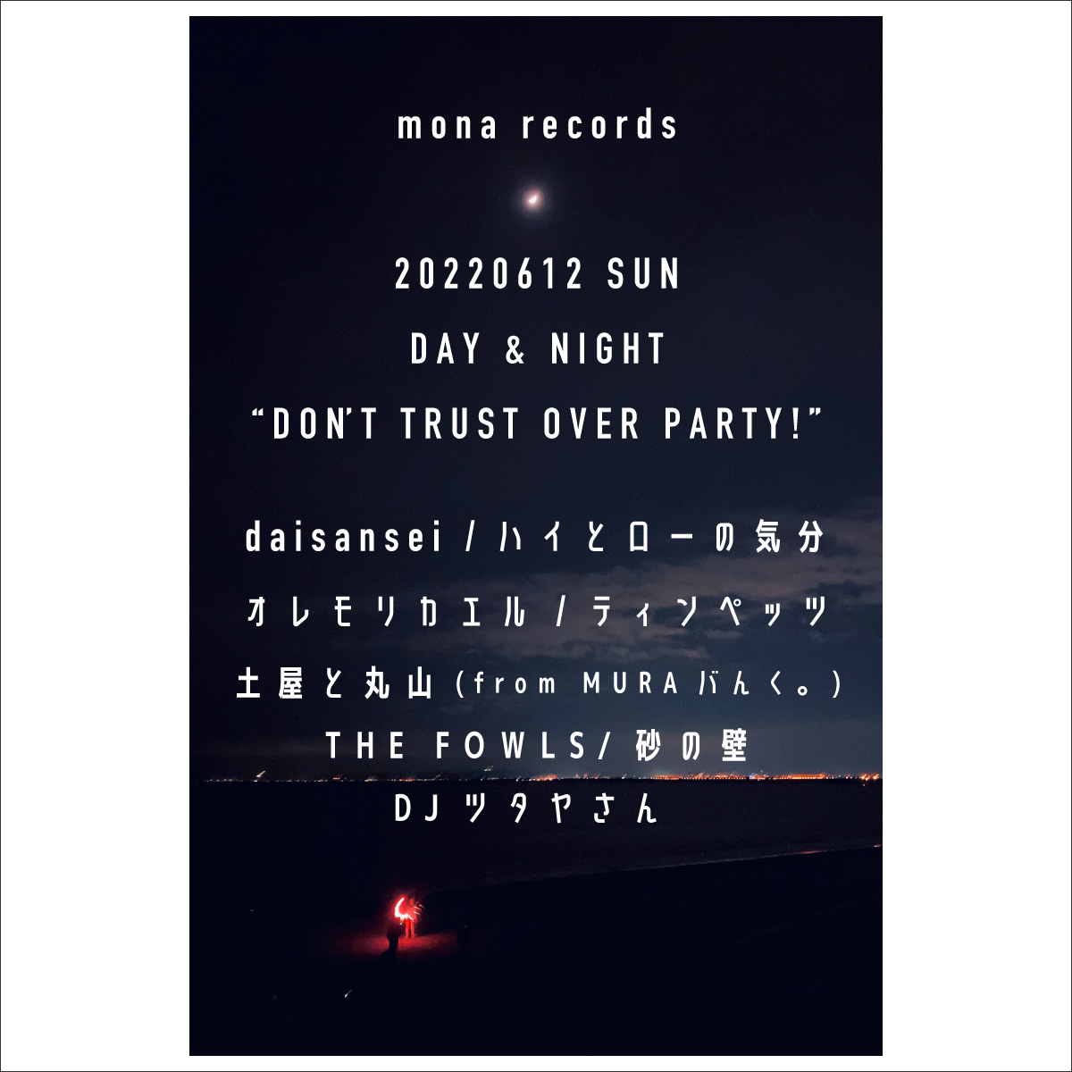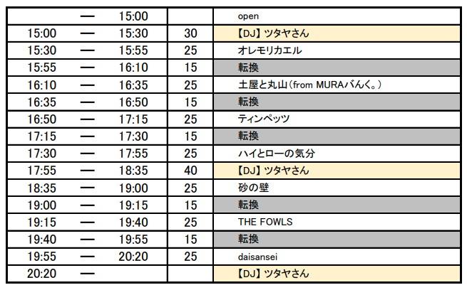 | 出演 | 《LIVE》daisansei / ハイとローの気分 / ティンペッツ / オレモリカエル / 土屋と丸山(from MURAバんく。)/ THE FOWLS / 砂の壁