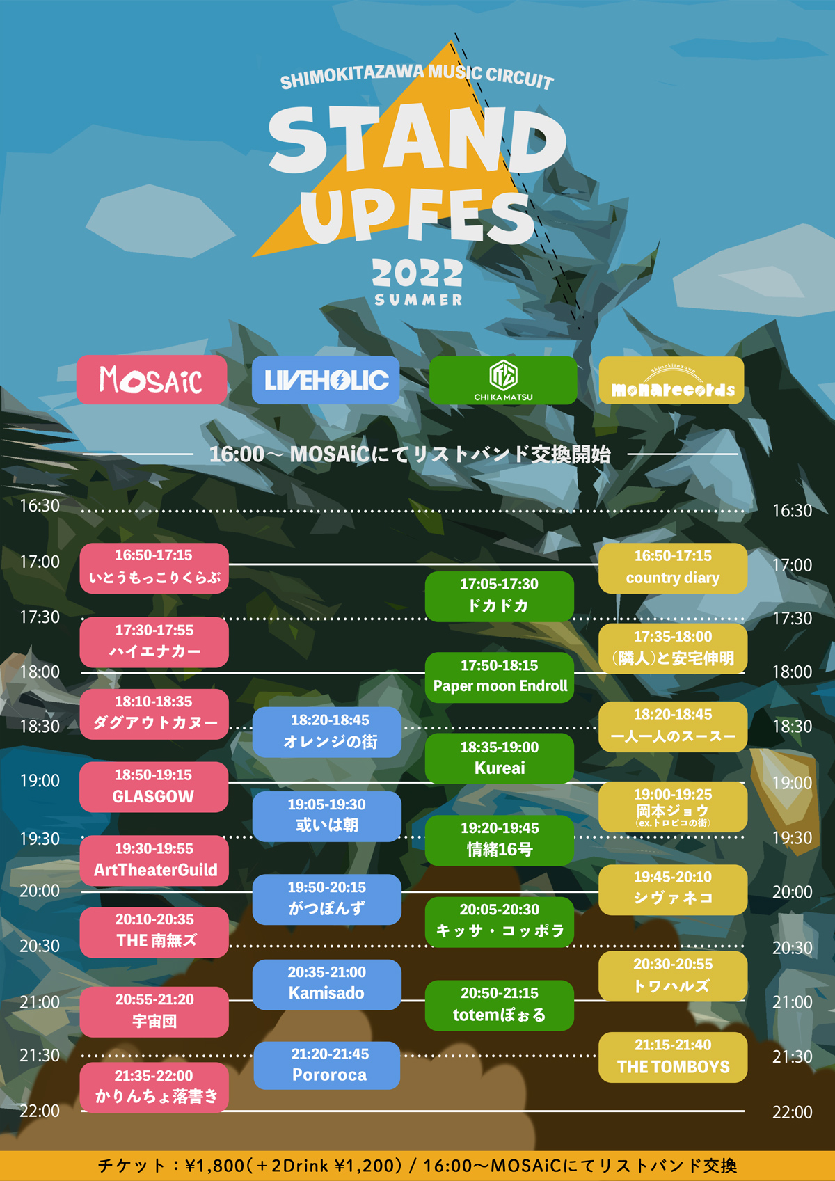 8月2日(火)開催の『Stand Up Fes 2022』に関しまして出演予定の下記アーティストが出演キャンセルとなりました。 タイムテーブルに変更がございますので、ご来場予定の方はご確認をお願いいたします。
