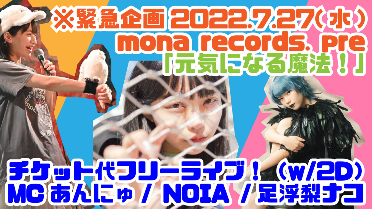 出演予定だった足浮梨ナコさん、NOIAさん、MCあんにゅさんの3組で『元気になる魔法!』(主催:mona records)を別公演として開催致します。