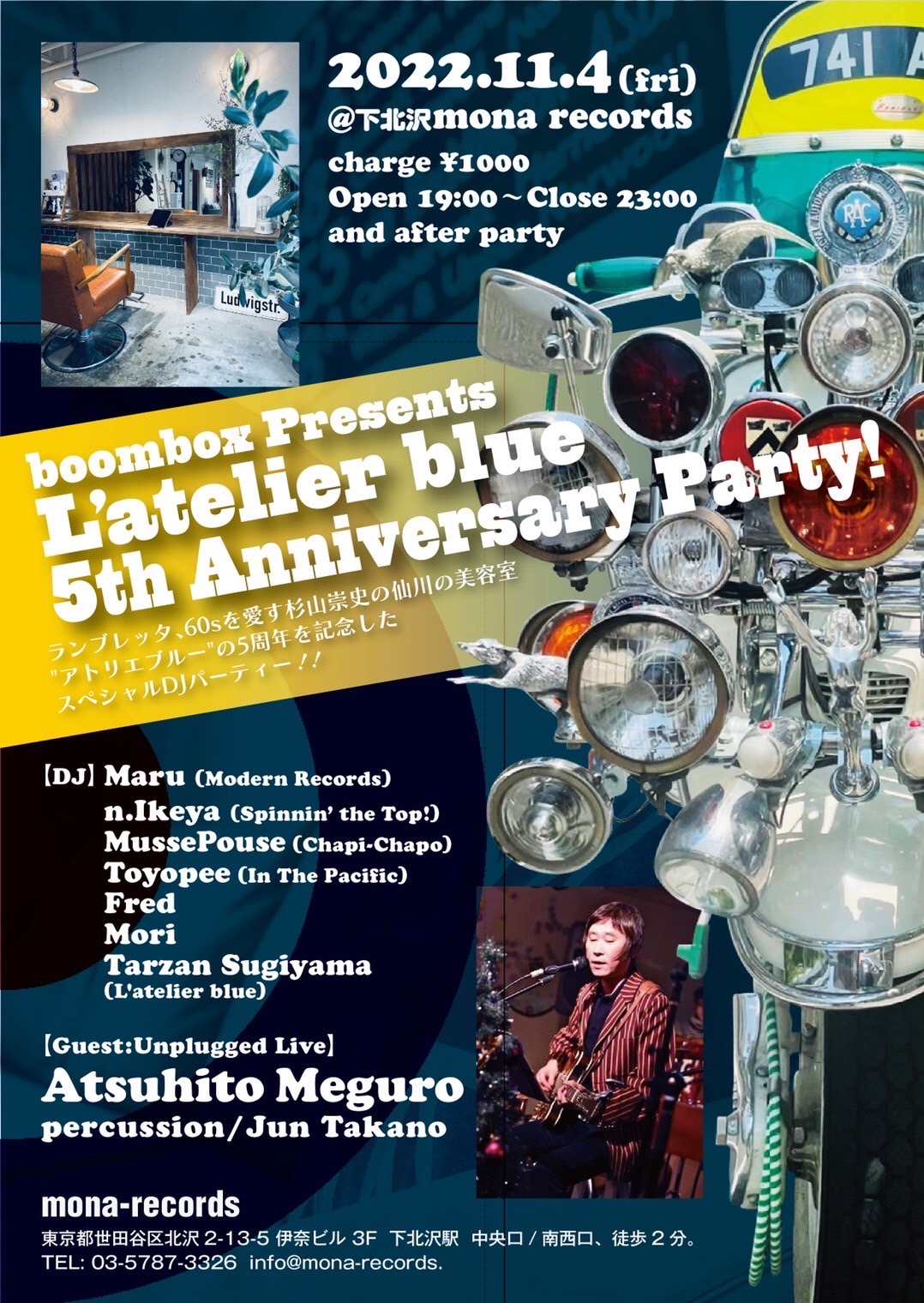 | 出演 | 【DJ】 ⚫️Maru(Modern Records) ⚫️n.Ikeya (Spinnin’ the Top!) ⚫️MussePouse (Chapi-Chapo) ⚫️Toyopee (In The Pacific) ⚫️Fred ⚫️Mori ⚫️Tarzan Sugiyama(L'atelier blue) 【guest: Unplugged Live】 ⚫️Atsuhito Meguro percussion /Jun Takano ランブレッタ、60sを愛す杉山崇史の仙川の美容室"アトリエブルー"の5周年を記念したスペシャルDJパーティー!! |