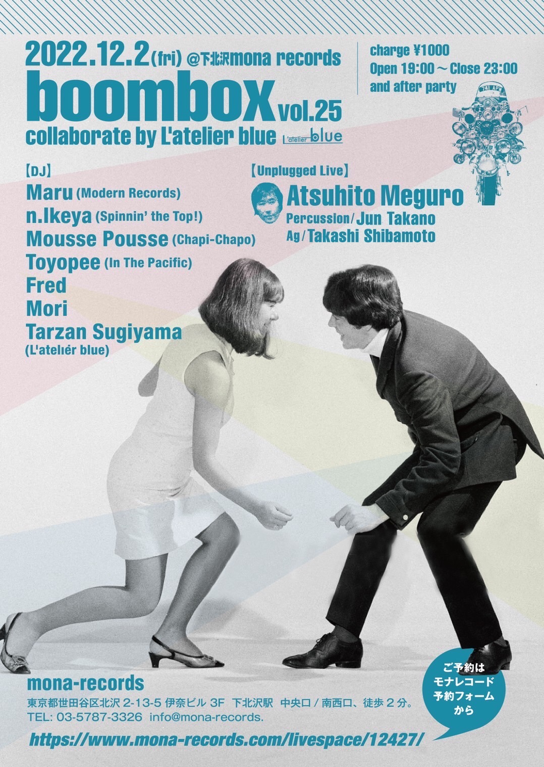 | 出演 | 【DJ】 ⚫️Maru(Modern Records) ⚫️n.Ikeya (Spinnin’ the Top!) ⚫️MussePouse (Chapi-Chapo) ⚫️Toyopee (In The Pacific) ⚫️Fred ⚫️Mori ⚫️Tarzan Sugiyama(L'atelier blue) 【Unplugged Live】 ⚫️Atsuhito Meguro percussion /Jun Takano and more! |