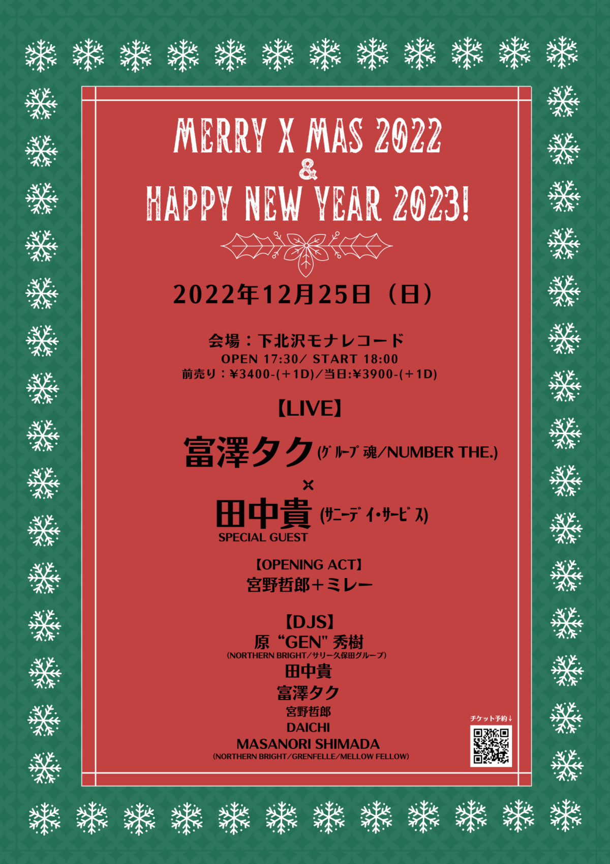 | 出演 | 【LIVE】 富澤タク(グループ魂/Number the.)×Special Guest:田中貴(サニーデイ・サービス) 【OPENING ACT】 宮野哲郎+ミレー 【DJs】 原“GEN"秀樹(NORTHERN BRIGHT/サリー久保田グループ) 田中貴(サニーデイ・サービス) 富澤タク(グループ魂/Number the.) Masanori Shimada(NORTHERN BRIGHT /Grenfelle/Mellow Fellow) 宮野哲郎 DAICHI |