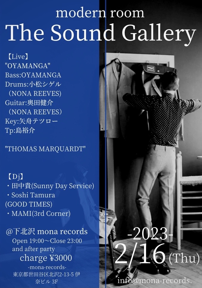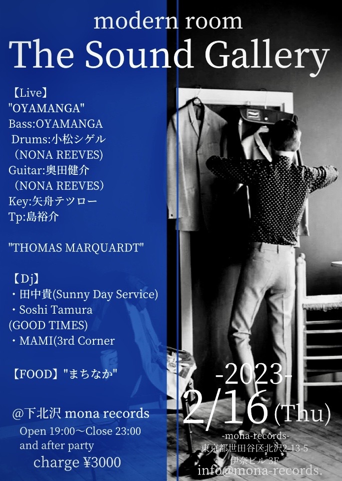 | 出演 | 【Live】 ・OYAMANGA Bass:OYAMANGA Drums:小松シゲル(NONA REEVES) Guitar:奥田健介(NONA REEVES) Key:矢舟テツロー Tp,Fl:島裕介 ・THOMAS MARQUARDT 【DJ】 ・田中貴(サニーデイ・サービス) ・Soshi Tamura(GOOD TIMES) ・MAMI(3rd Corner) 【FOOD】 まちなか |