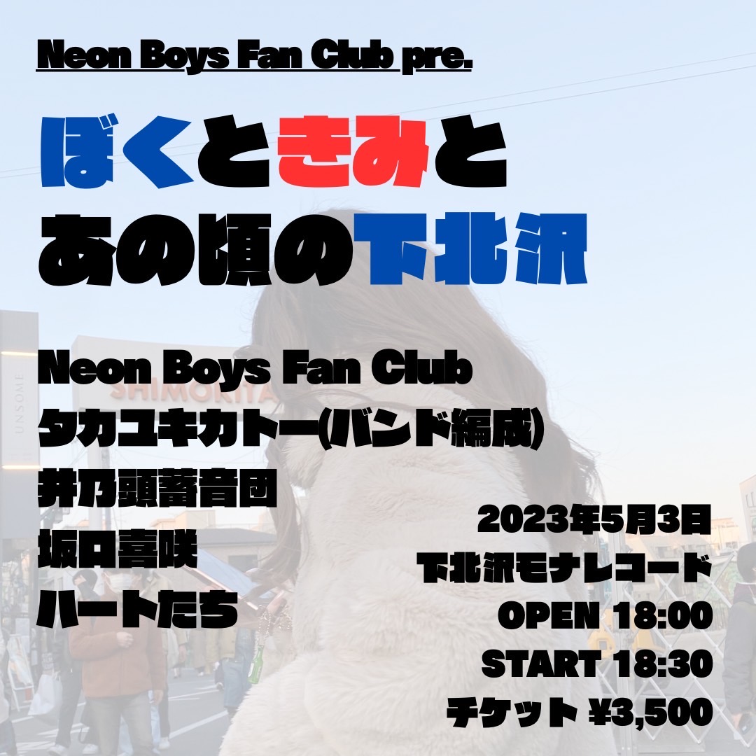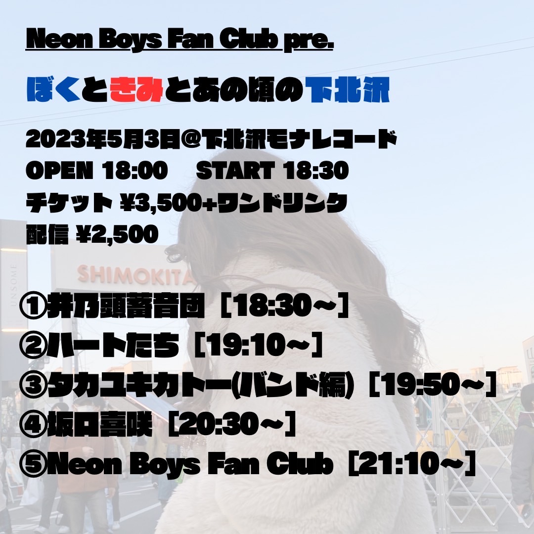 | 出演 | Neon Boys Fan Club / タカユキカトー(バンド編成) / 井乃頭蓄音団 / 坂口喜咲 / ハートたち |