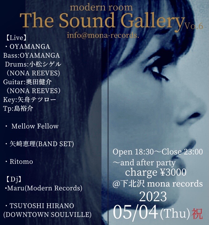 | 出演 | 【Live】 ・OYAMANGA Bass:OYAMANGA Drums:小松シゲル(NONA REEVES) Guitar:奥田健介(NONA REEVES) Key:矢舟テツロー Tp:島裕介 ・Mellow Fellow ・矢崎恵理(BAND SET) ・Ritomo 【Dj】 •Maru(Modern Records) ・TSUYOSHI HIRANO (DOWNTOWN SOULVILLE) |