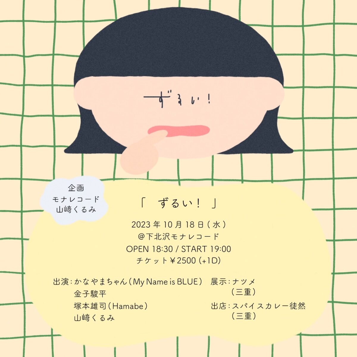 | 出演 | 【出演者】山﨑くるみ / 金子駿平 / 塚本 雄司(Hamabe) / かなやまちゃん(My Name is BLUE) 【出店】スパイスカレー徒然 【展示】ナツメ |