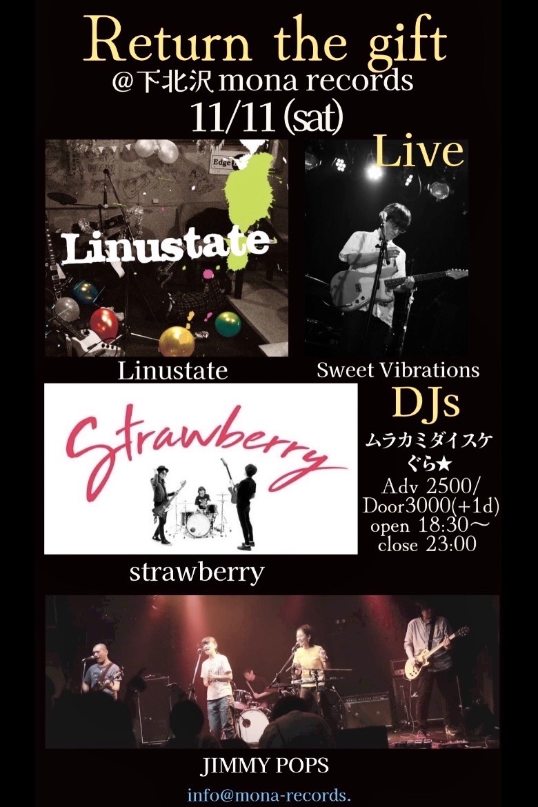 | 出演 | 【LIVE】 ・Linustate ・ Sweet Vibrations ・ JIMMY POPS ・ strawberry 【DJ】 ・ムラカミダイスケ ・ぐら★ |