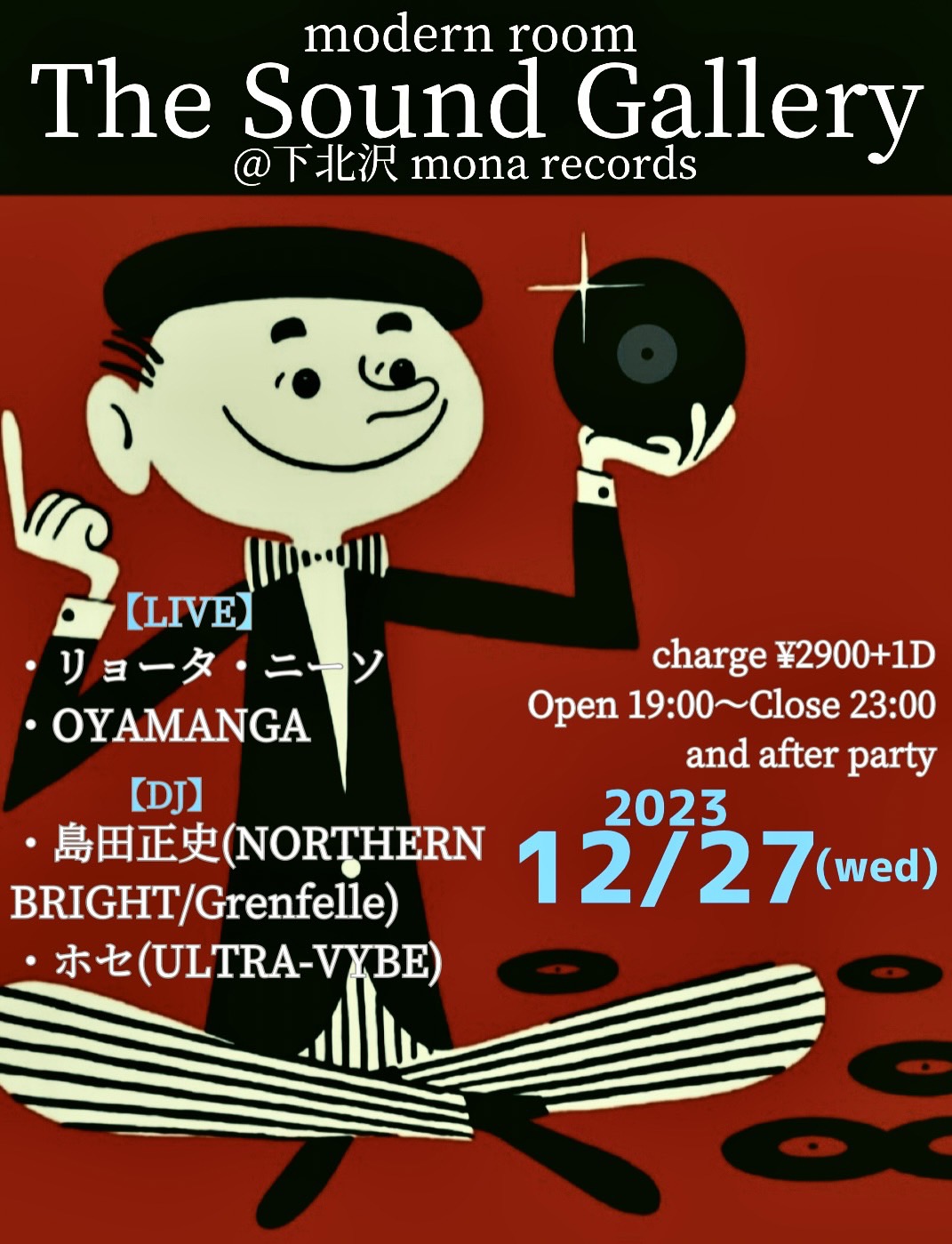 | 出演 | 【LIVE】 ・リョータ・ニーソ with 加藤雄一郎 (sax) ・OYAMANGA Bass:OYAMANGA Drums:小松シゲル(NONA REEVES) Guitar:奥田健介(NONA REEVES) Key:矢舟テツロー Tp:島裕介 【DJ】 ・島田正史(NORTHERN BRIGHT/Grenfelle) ・ホセ(ULTRA-VYBE) |
