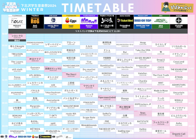会場:MOSAiC / CLUB 251 / ReG / LIVEHOLIC / ろくでもない夜 / WAVER / mona rechords / ERA / Flowers Loft / LIVEHAUS