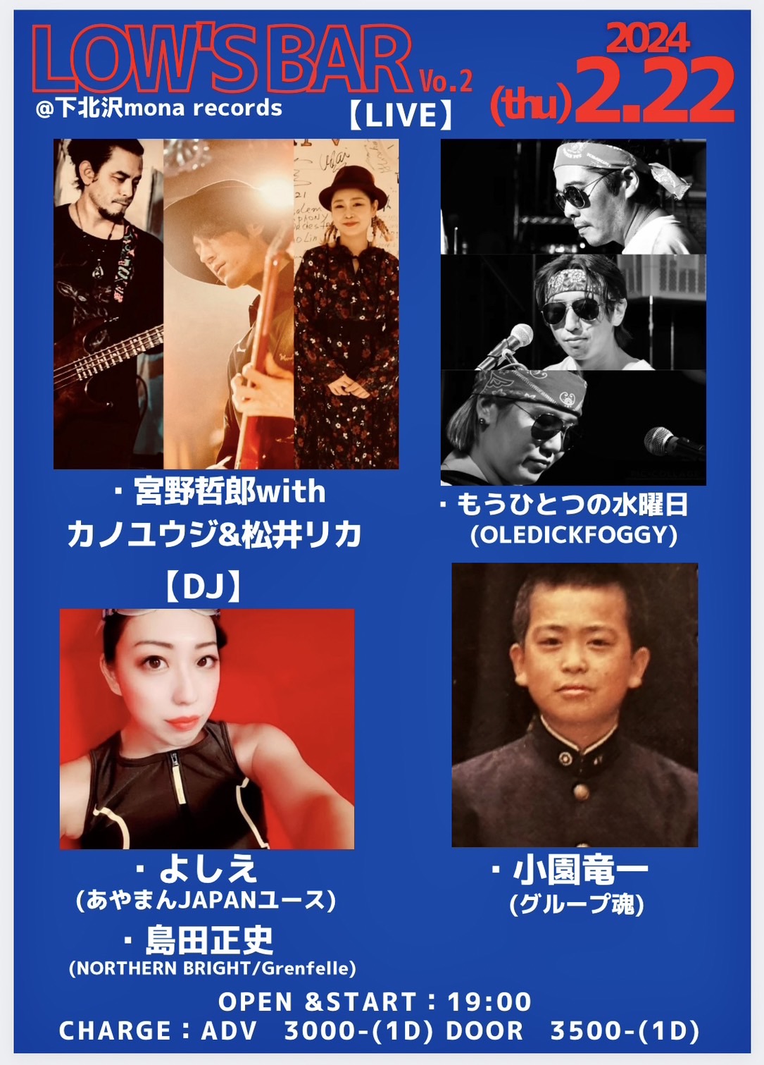 | 出演 | 【LIVE】 ・宮野哲郎withカノユウジ&松井リカ ・もうひとつの水曜日(OLEDICKFOGGY) ・小園竜一(グループ魂) 【DJ】 ・よしえ(あやまんJAPANユース) ・島田正史(NORTHERN BRIGHT/Grenfelle) |