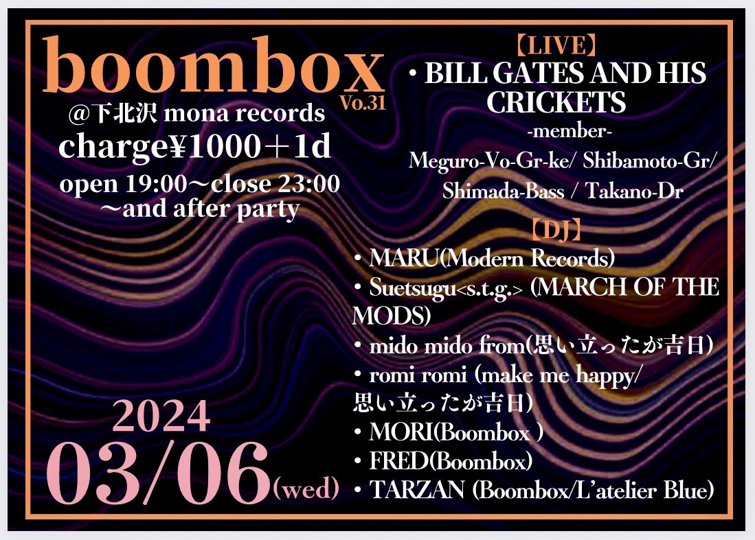 | 出演 | 【DJ】 •MARU(Modern Records) •Suetsugu(MARCH OF THE MODS) •mido mido from(思い立ったが吉日) • romi romi (make me happy/思い立ったが吉日) •MORI(Boombox ) •FRED(Boombox) •TARZAN (Boombox/L’atelier Blue) 【Floor Live】 •BILL GATES AND HIS CRICKETS -member- Atsuhito Meguro-Vocals/Guitar/key with.. Takashi Shibamoto-Guitar/Backing Vocals Masanori Shimada-Bass Guitar/Backing Vocals Jun Takano-Dr/Backing Vocals |