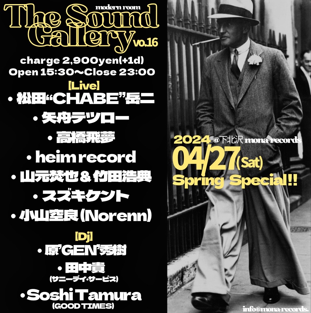 | 出演 | 【LIVE】 ・松田“CHABE”岳二 ・矢舟テツロー ・高橋飛夢 ・heim record ・山元焚也&竹田浩典 ・スズキケント ・小山空良 (Norenn) 【DJ】 ・原’GEN’秀樹 ・田中貴(サニーデイ・サービス) ・Soshi Tamura (GOOD TIMES) |
