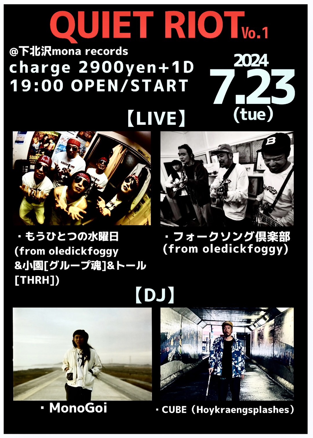 | 出演 | 【LIVE】 ・もうひとつの水曜日(from oledickfoggy&小園[グループ魂]&トール[THRH]) ・フォークソング倶楽部(from oledickfoggy) 【DJ】 ・CUBE(Hoykraengsplashes) ・MonoGoi |