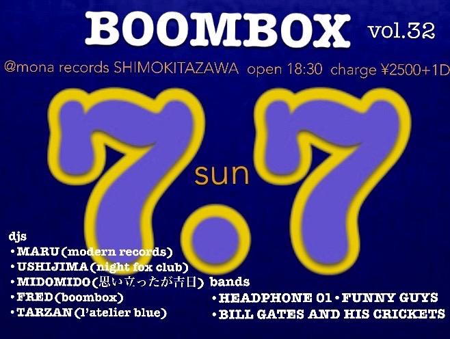 | 出演 | 【Dj】 •MARU (modern records) •USHIJIMA (night fox club) •MIDOMIDO(思い立ったが吉日) •FRED(boombox) •TARZAN (l'atelier blue) 【Bands】 • headphone01 •funny guys •bill gates and his crickets |