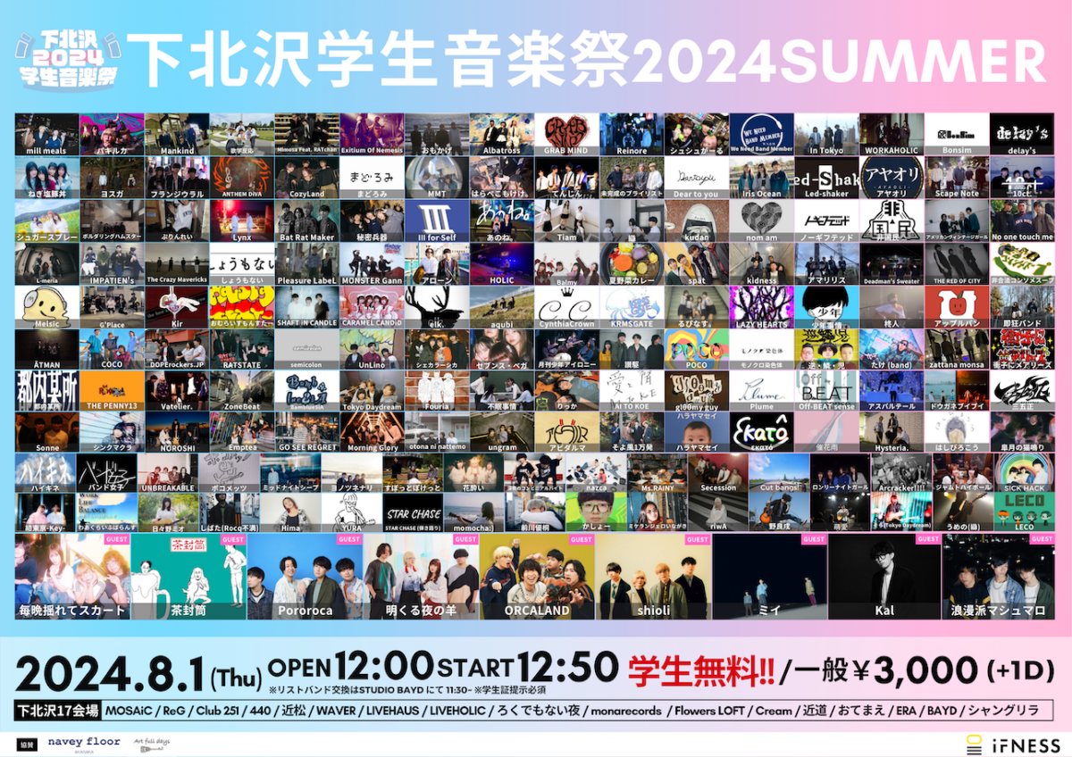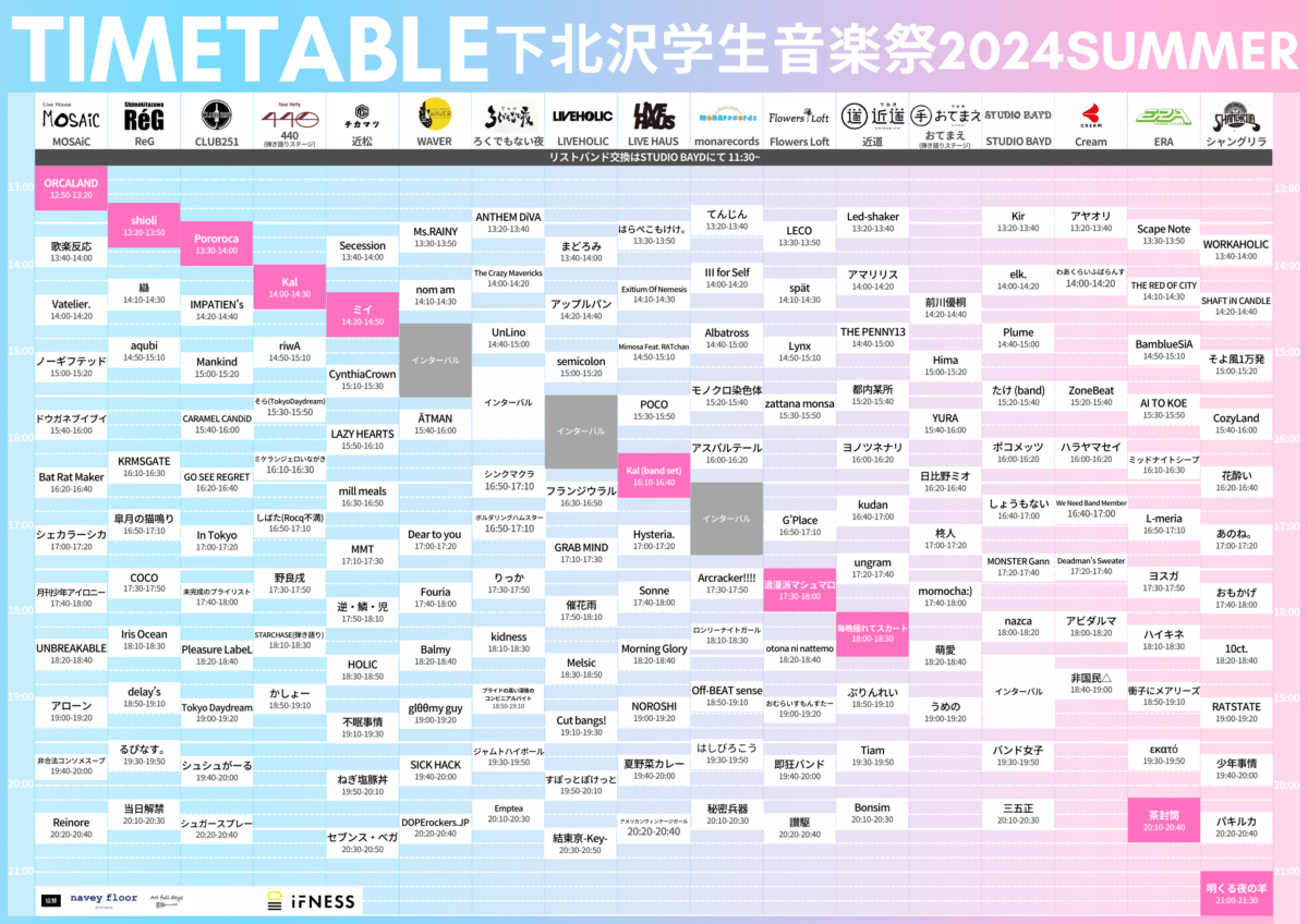 | 出演 | 会場:MOSAiC / CLUB 251 / 440 / ReG / LIVEHOLIC / ろくでもない夜 / WAVER / mona records / ERA / Flowers Loft / LIVEHAUS / 近松 / 近道 / おてまえ / Cream / BAYD / Shangri-La |