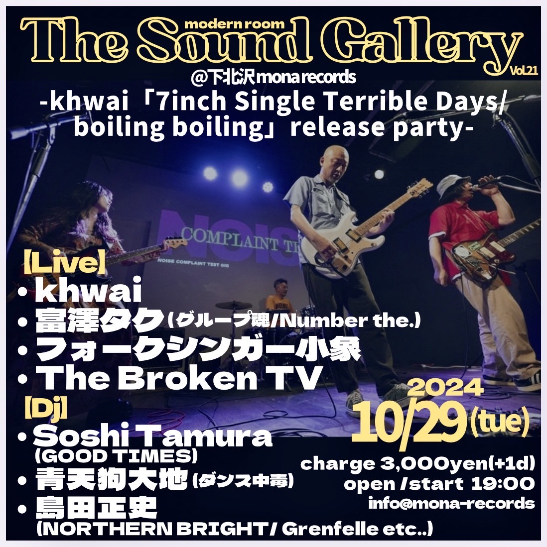 | 出演 | 【LIVE】 ・Khwai ・The Broken TV ・フォークシンガー小象 ・富澤タク 【DJ】 ・Soshi Tamura(GOOD TIMES) ・青天狗大地(ダンス中毒) ・島田正史(NORTHERN BRIGHT/ Grenfelle etc..) |