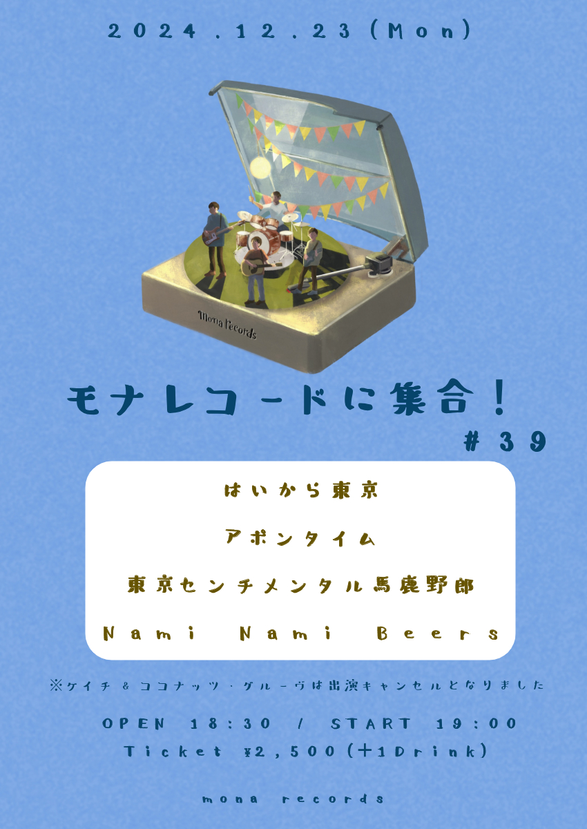 | 出演 | アポンタイム / はいから東京 / 東京センチメンタル馬鹿野郎 / Nami Nami Beers ※ご出演予定だったケイチ&ココナッツ・グルーヴは体調不良のため、出演キャンセルとなりました。 (12/21) |