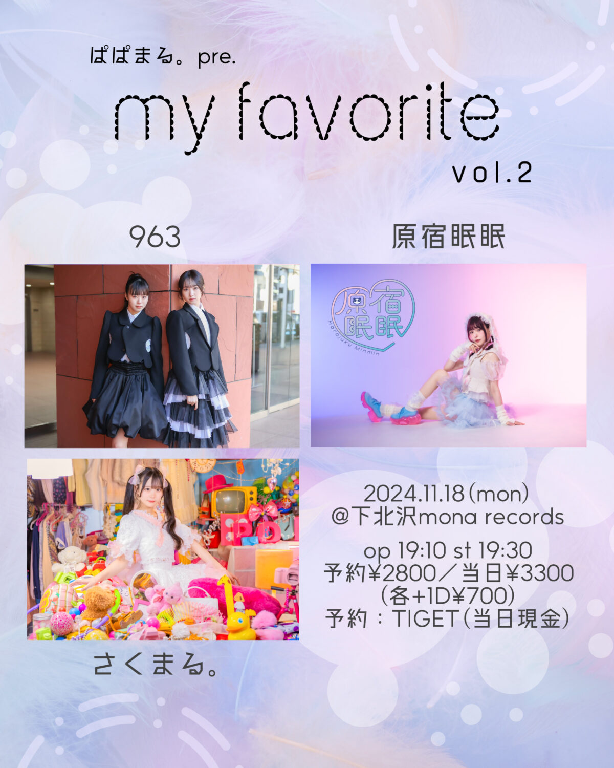 //🌸さくまる。LIVE情報🌸\ぱぱまる。pre.『my favorite vol.2』11月18日(月) 下北沢mona recordsOPEN19:10 / START19:30🎫チケット予約¥2,800/当日¥3,300(各+1D¥700)当日現金払い10/29(火)21:00〜予約受付開始(予約サイトURLは後日お知らせいたします) pic.twitter.com/s07KDO1a1n