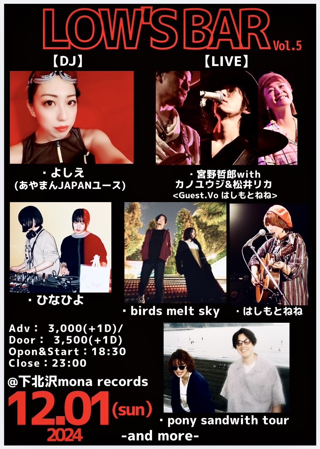 | 出演 | 【Live】 ・宮野哲郎withカノユウジ&松井リカ(Guest.Vo はしもとねね) ・birds melt sky ・pony sandwich tour and more 【Dj】 ・よしえ(あやまんJAPANユース) ・ひなひよ |