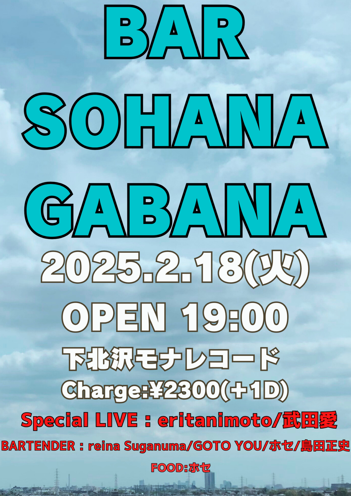 | 出演 | 【Special LIVE】 eritanimoto 武田愛 【BARTENDER】 Reina Suganuma/Go to YOU/ホセ/島田正史 【FOOD】 ホセ |