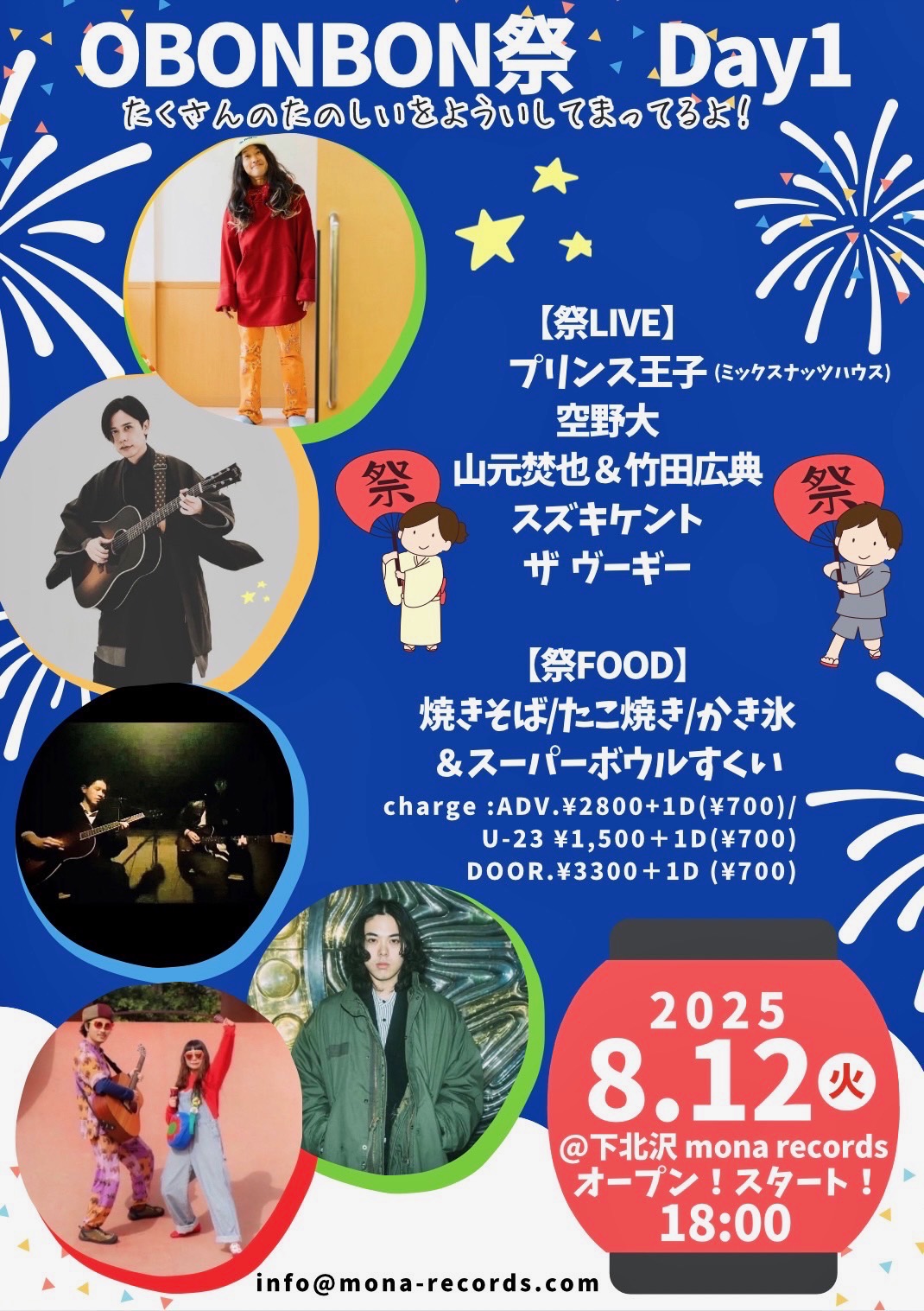 | 出演 | 【祭LIVE】 プリンス王子(ミックスナッツハウス) 空野大 山元焚也&竹田広典 スズキケント ザ ヴーギー 【祭FOOD】 焼きそば/たこ焼き/かき氷 &スーパーボウルすくい |
