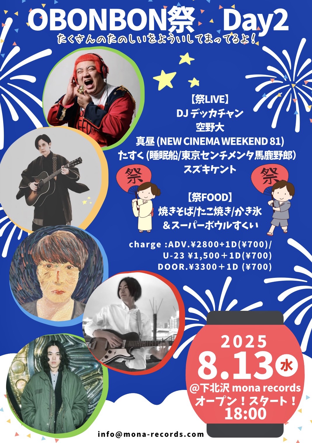 | 出演 | 【祭LIVE】 DJ デッカチャン 空野大 真昼(NEW CINEMA WEEKEND 81) たすく(睡眠船/東京センチメンタル馬鹿野郎) スズキケント 【祭FOOD】 焼きそば/たこ焼き/かき氷 &スーパーボウルすくい |