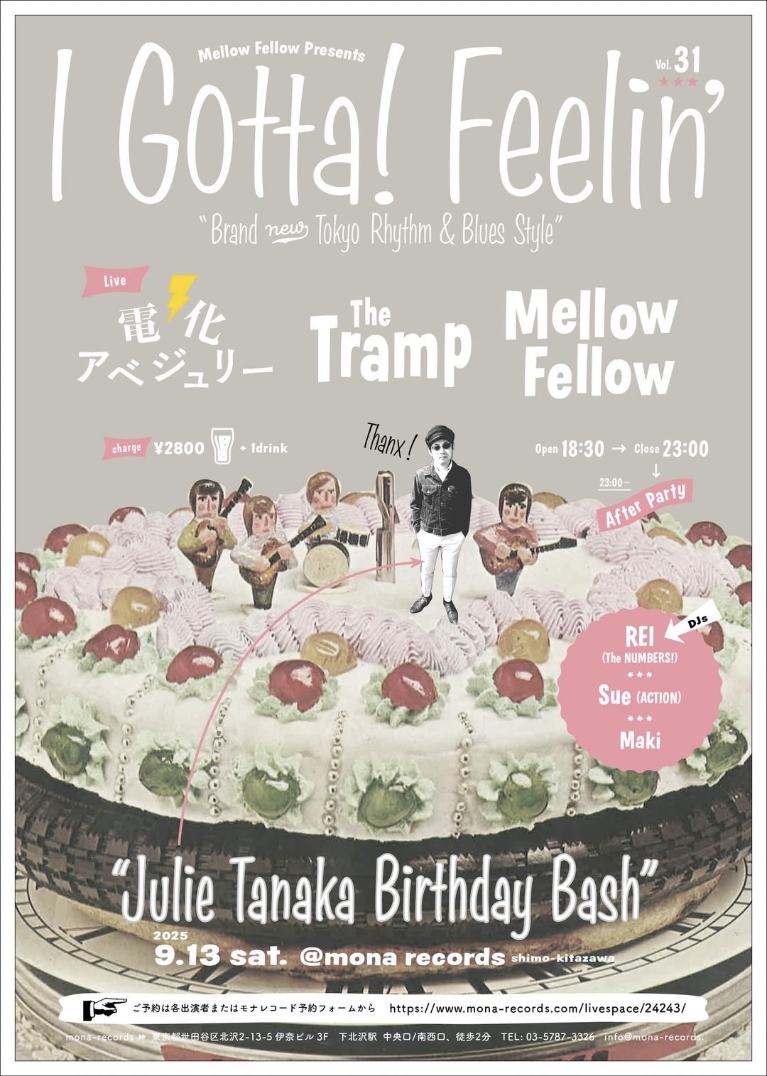 出演charge¥2800 +1d Open 18:30~Close 23:00 ~after party🍻 【Live】 ・電化アベジュリー ・The Tramp ・Mellow Fellow 【Dj】 ・REI(The NUMBERS!) ・Sue(ACTION) ・Maki