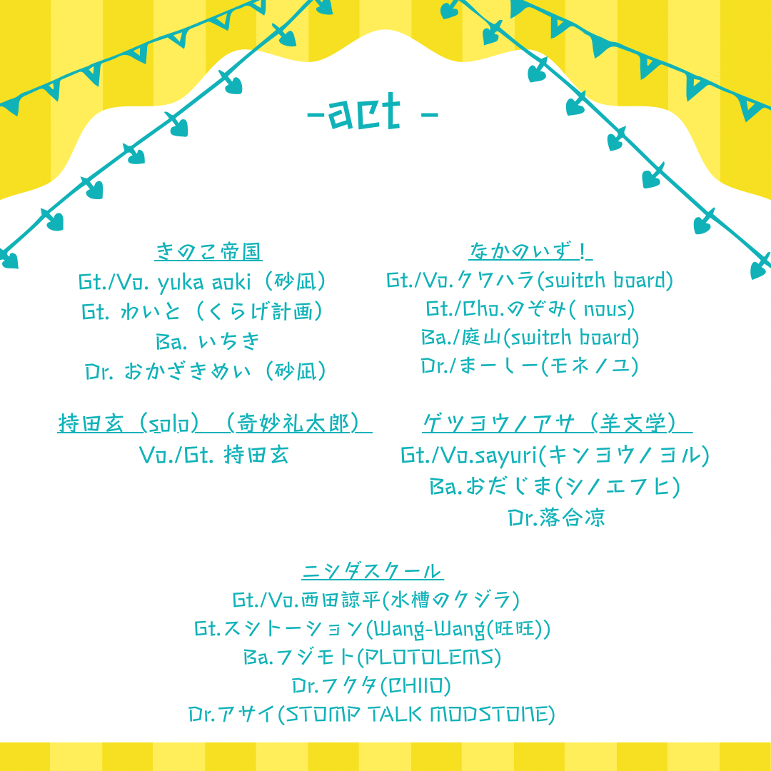 | 出演 | ゲツヨウノアサ(羊文学)/きのこ帝国/なかのいず!/ニシダスクール/持田玄(奇妙礼太郎) |
