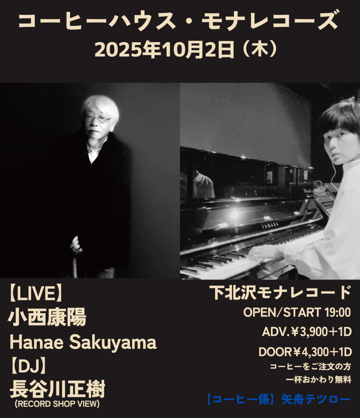 | 出演 | 【LIVE】 小西康陽 Hanae Sakuyama 【DJ】 長谷川正樹(RECORD SHOP VIEW) |
