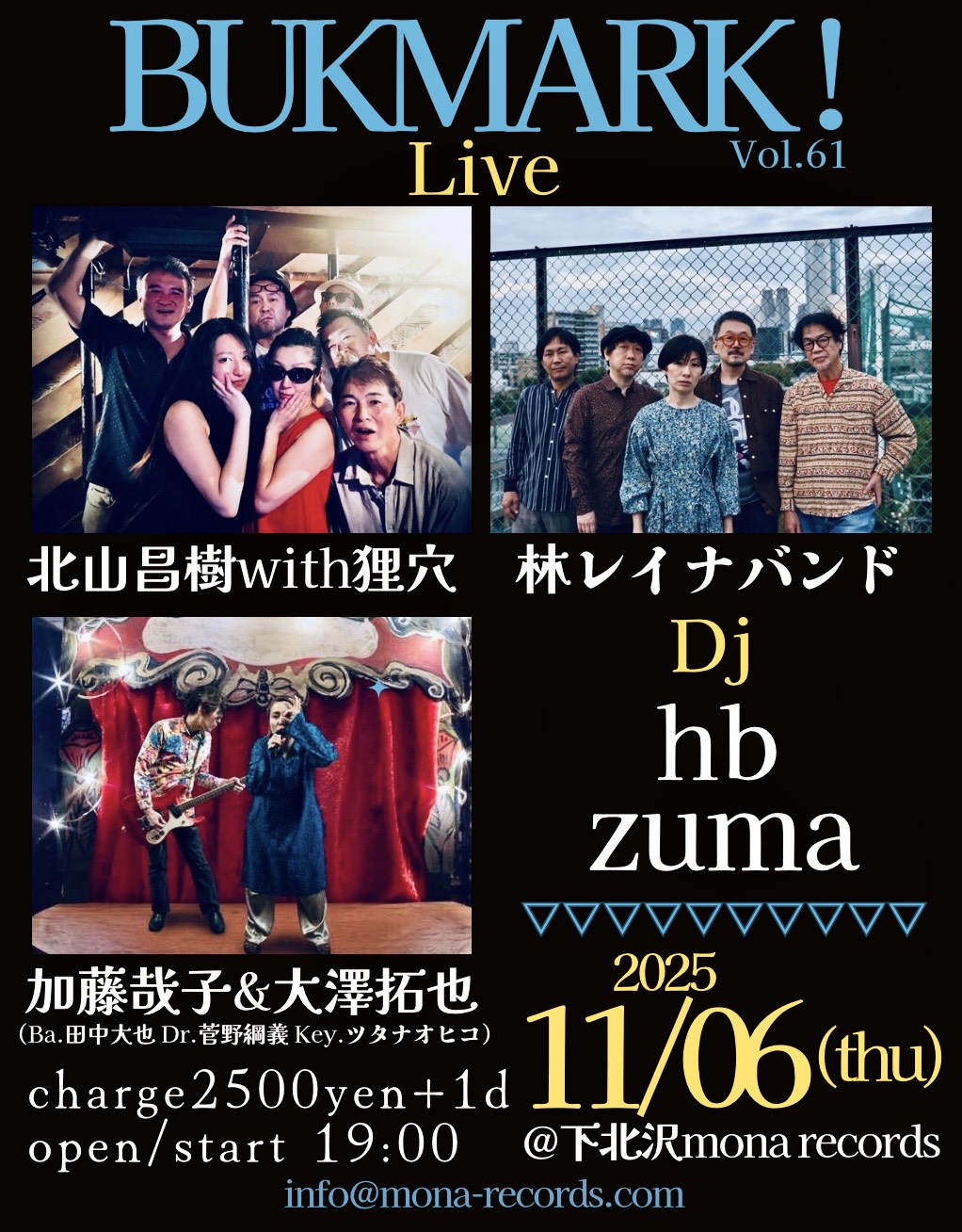 | 出演 | 【Live】 ・林レイナバンド ・加藤哉子&大澤拓也 (Ba.田中大也 Dr.菅野綱義 Key.ツタナオヒコ) ・北山昌樹with狸穴 【Dj】 ・ hb ・zuma |