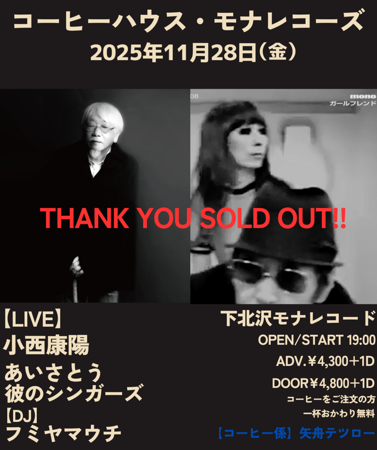 | 出演 | 【LIVE】 小西康陽 あいさとう 彼のシンガーズ 【DJ】 フミヤマウチ |