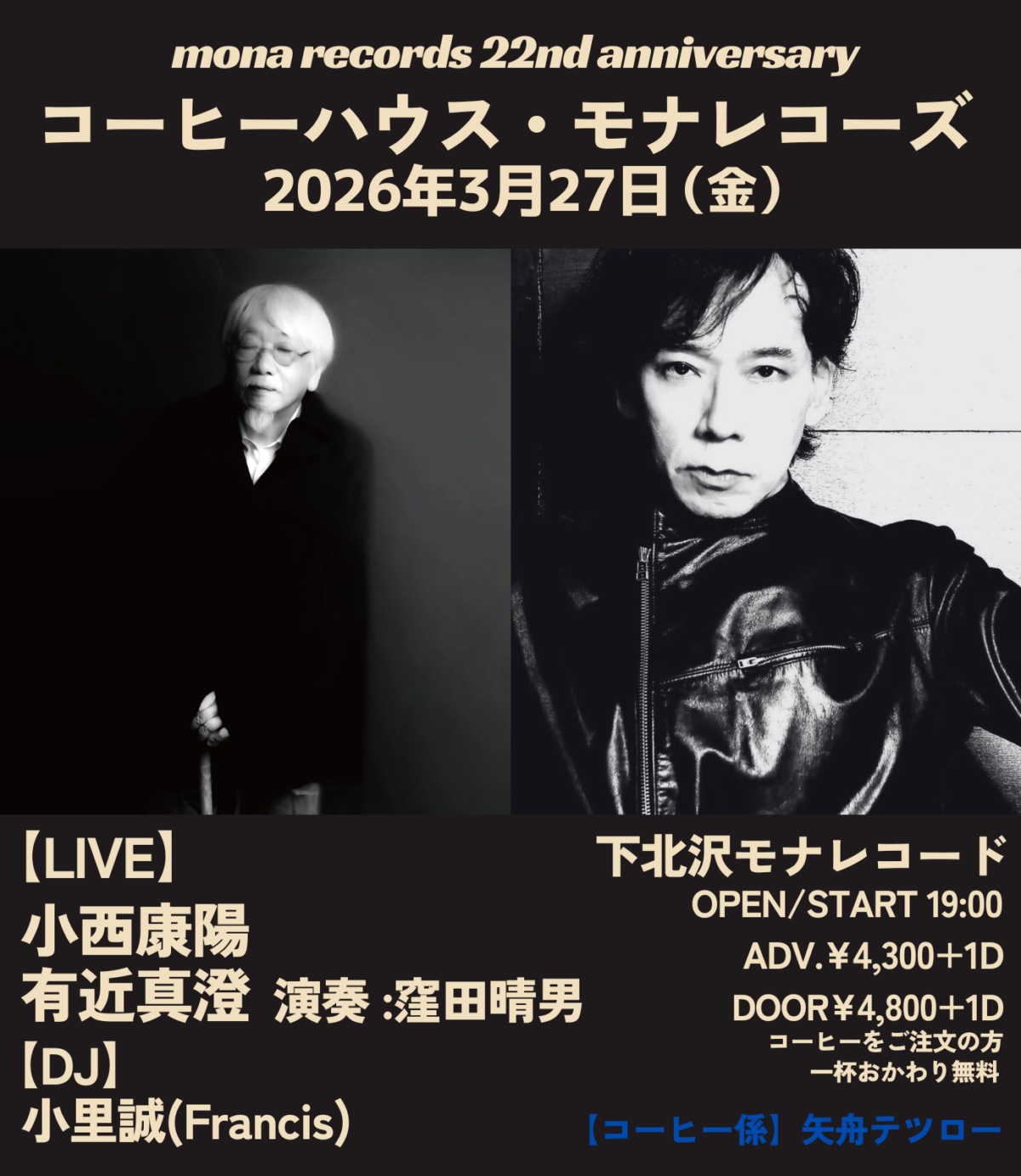 | 出演 | 【LIVE】 小西康陽 有近真澄 演奏:窪田晴男 【DJ】 小里誠(Francis) |