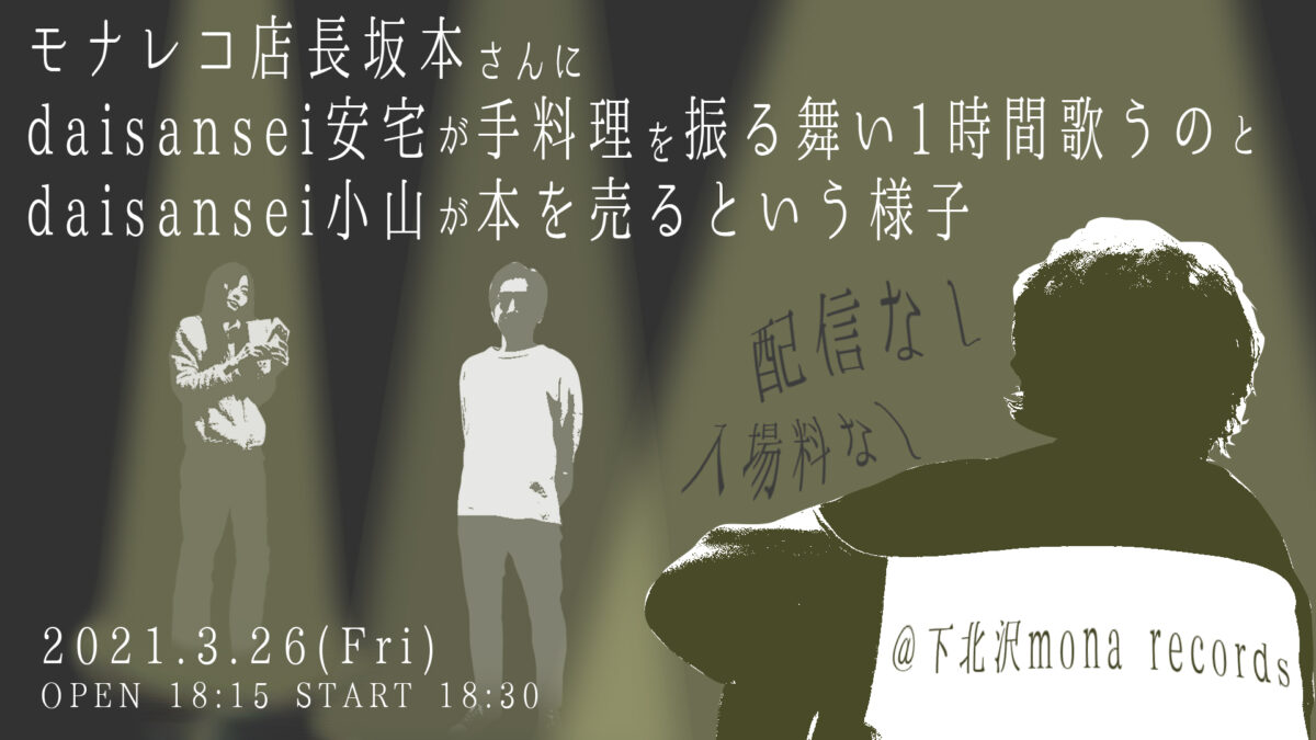 『モナレコ店長坂本さんにdaisansei安宅が手料理を振る舞い1時間歌うのとdaisansei小山が本を売るという様子』