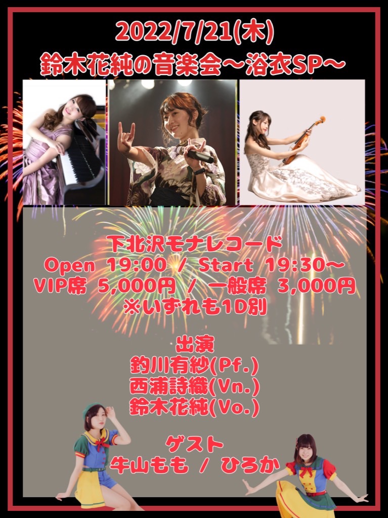 | 出演 | 釣川有紗(Pf.) / 西浦詩織(Vn.) / 鈴木花純(Vo.) 牛山もも / ひろか |